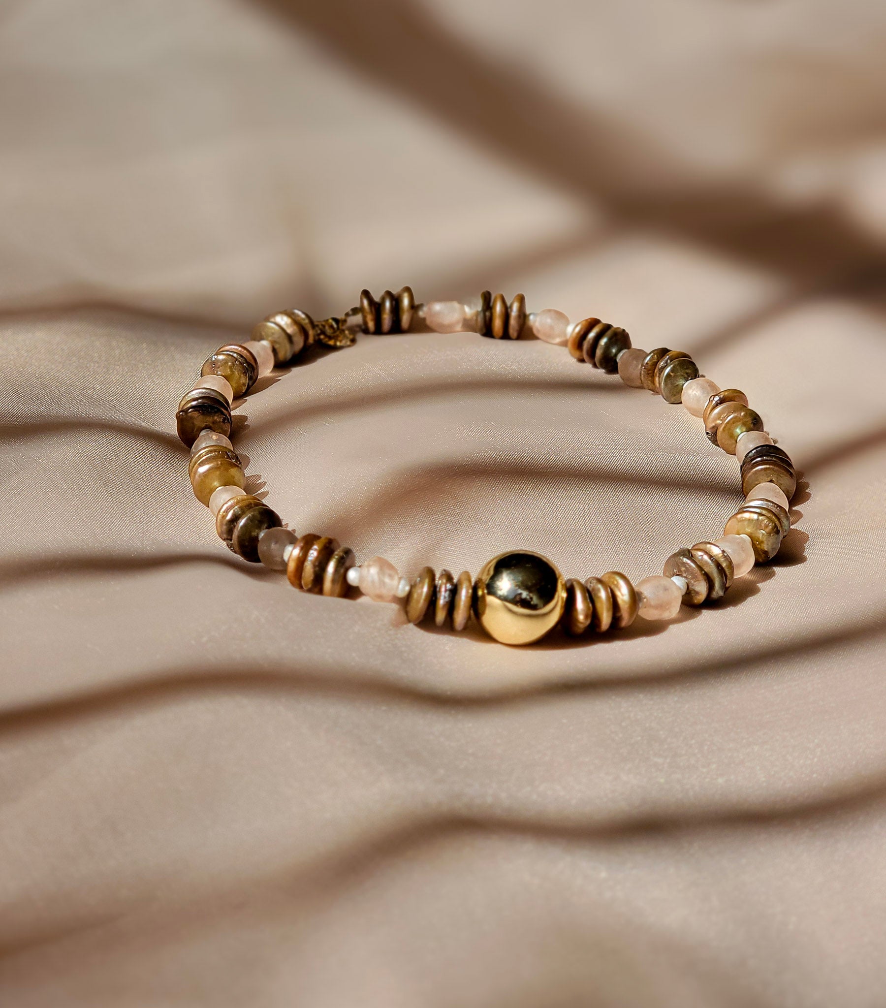 Este collar artesanal de edición limitada es una joya poderosa que evoca la energía de la tierra y el brillo del oro. Con una composición única de perlas genuinas, cristales naturales facetados y piezas en tonos tierra, destaca una esfera dorada central que simboliza fuerza, elegancia y magnetismo.