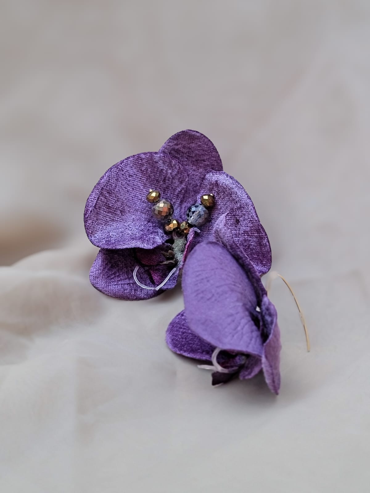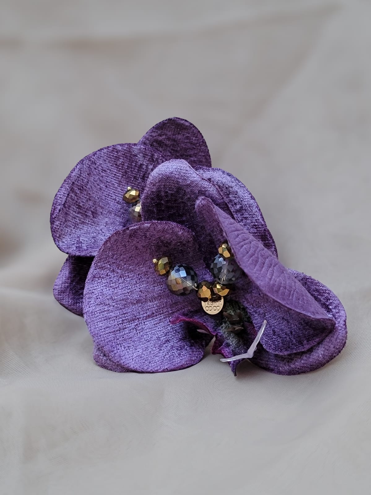 Sumérgete en la belleza exótica de las Orquídea Nocturna, una pieza floral atemporal que rinde homenaje a la feminidad poderosa y la elegancia salvaje. Cada pantalla está cuidadosamente confeccionada en pétalos de terciopelo violeta con reflejos profundos, acompañada de cristales facetados en tono dorado bronce que capturan la luz con cada movimiento.