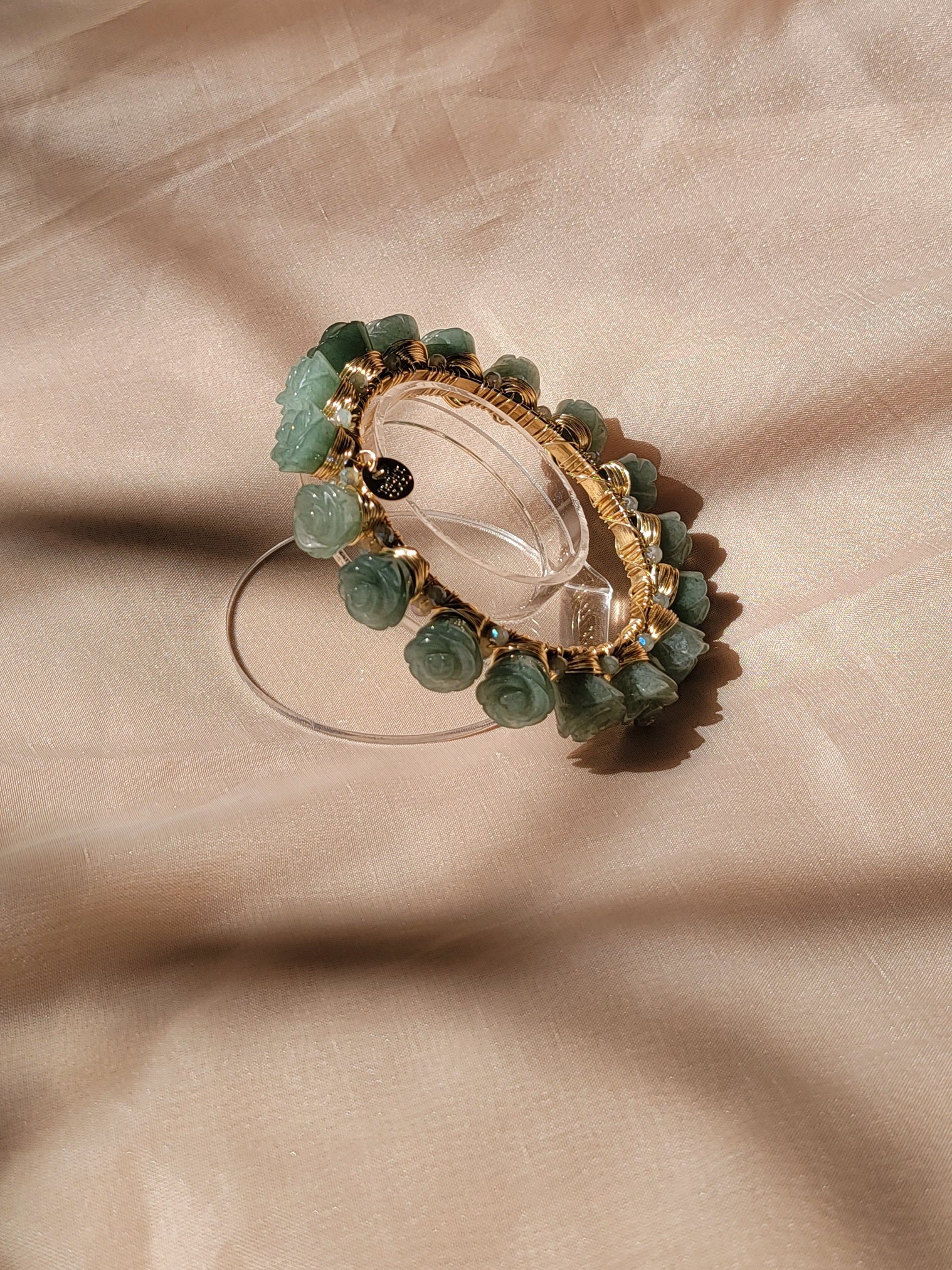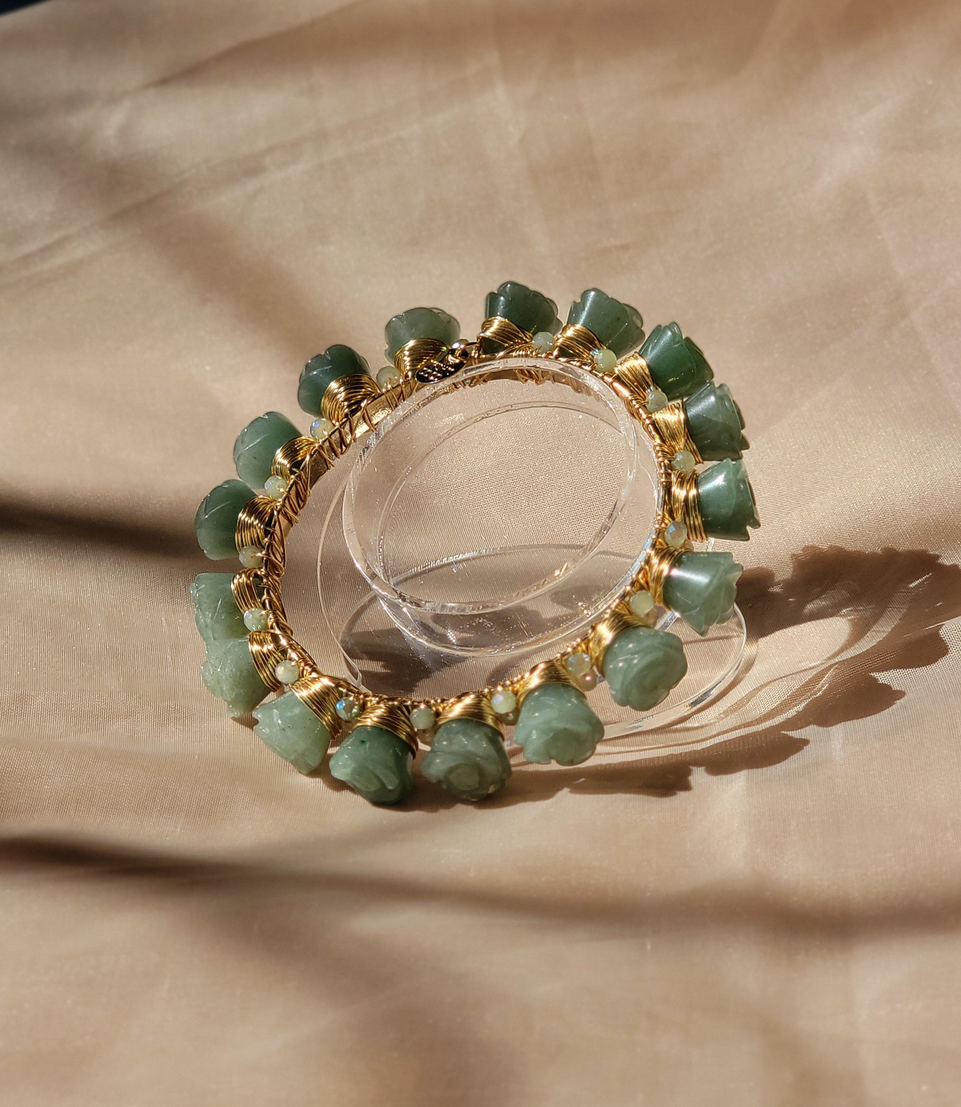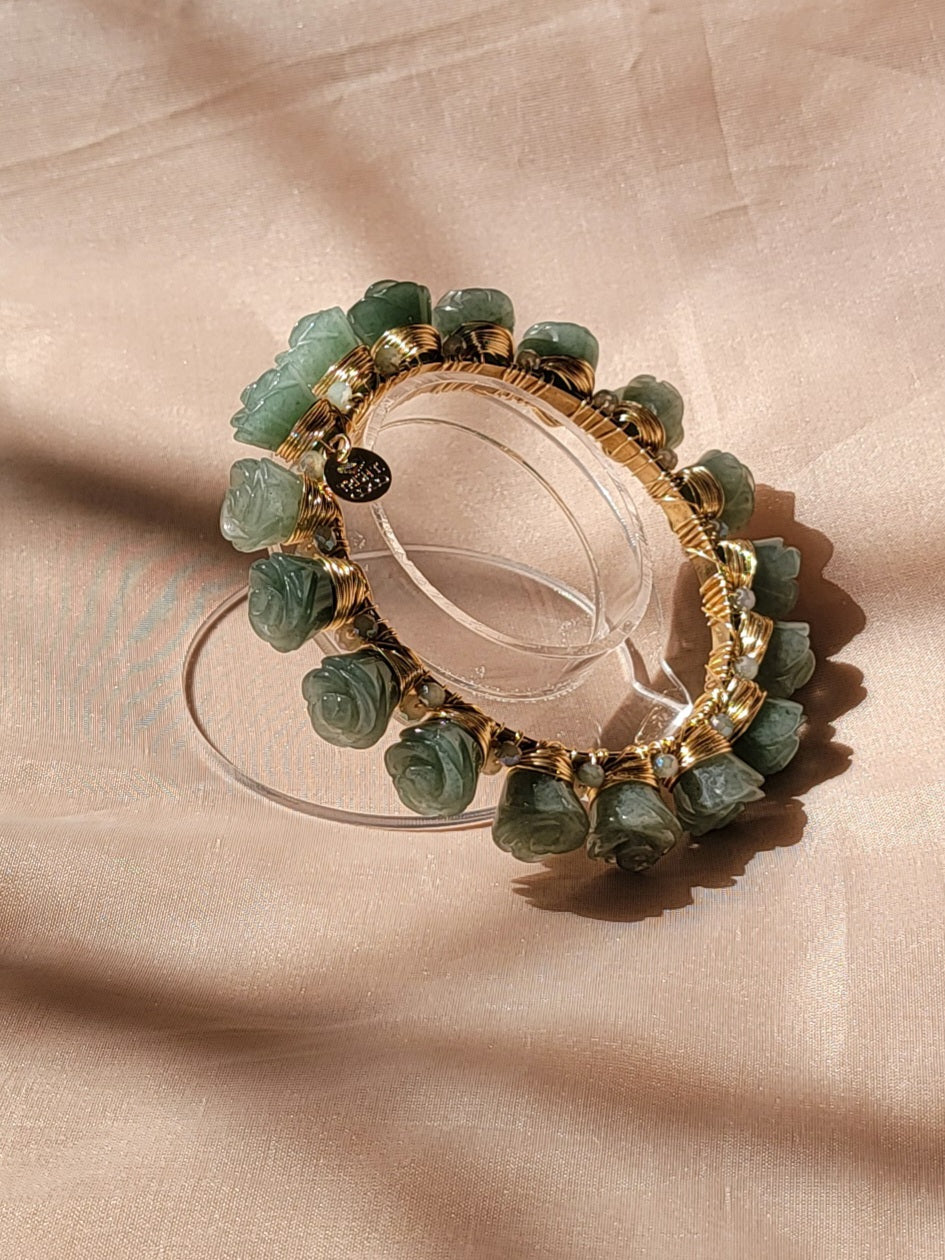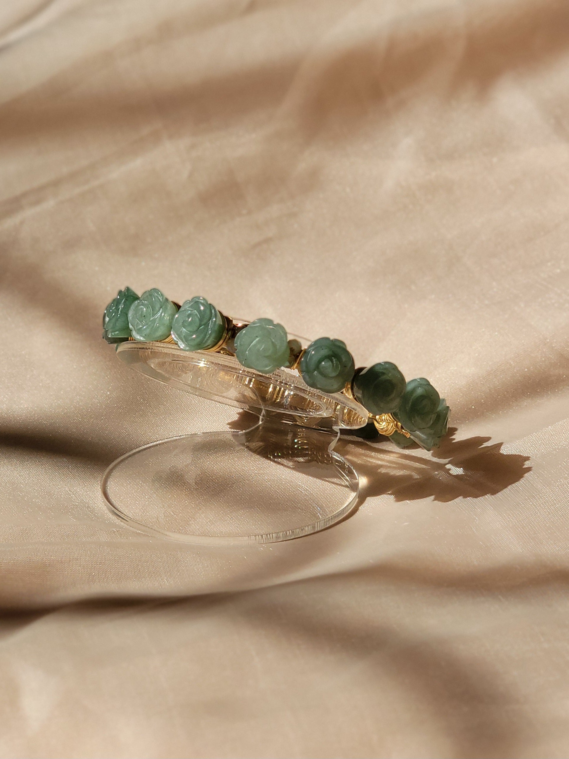 - Detalles: Piedras de jade verde talladas en delicadas formas de rosas, acompañadas de cristales austríacos entre cada piedra, que añaden un toque de brillo refinado.