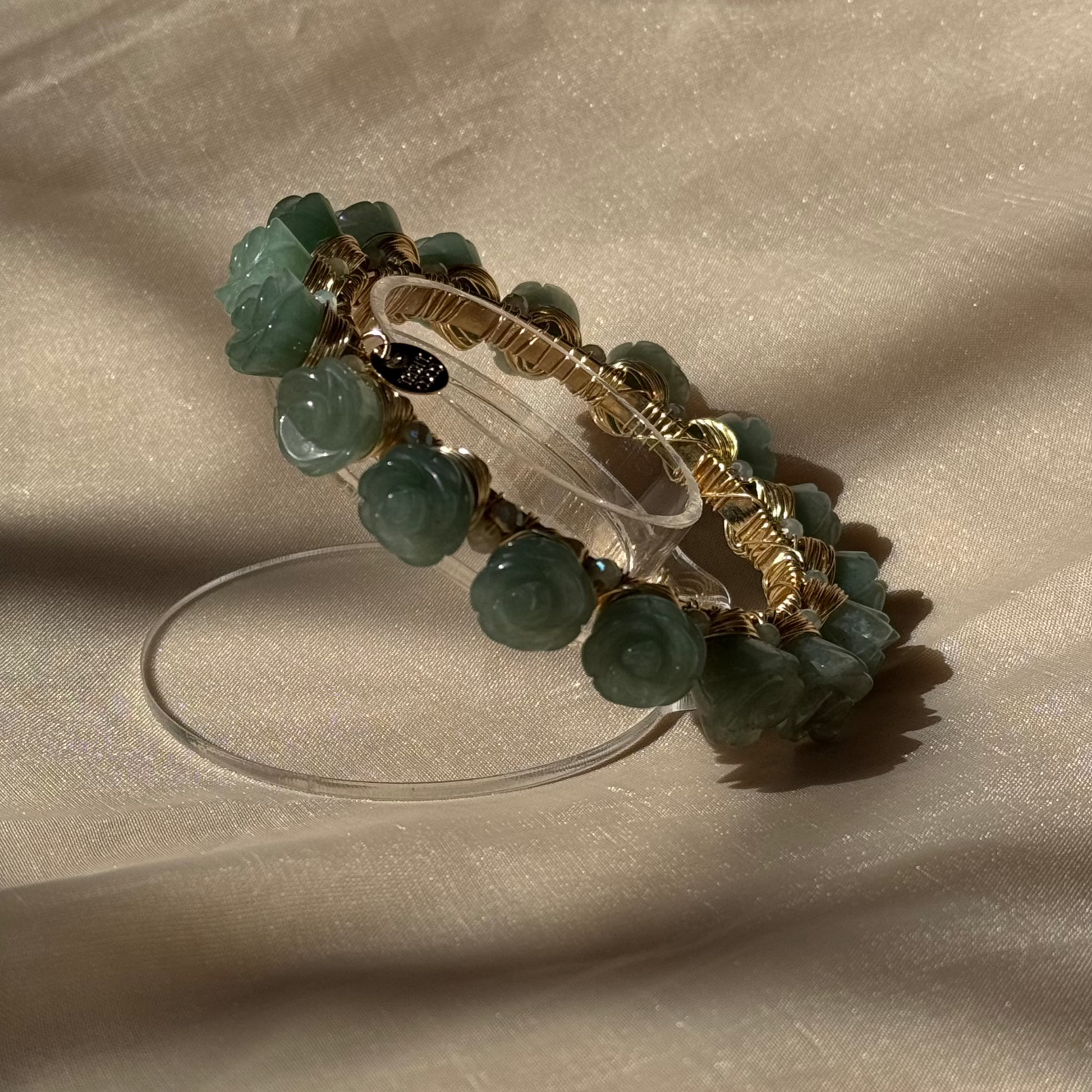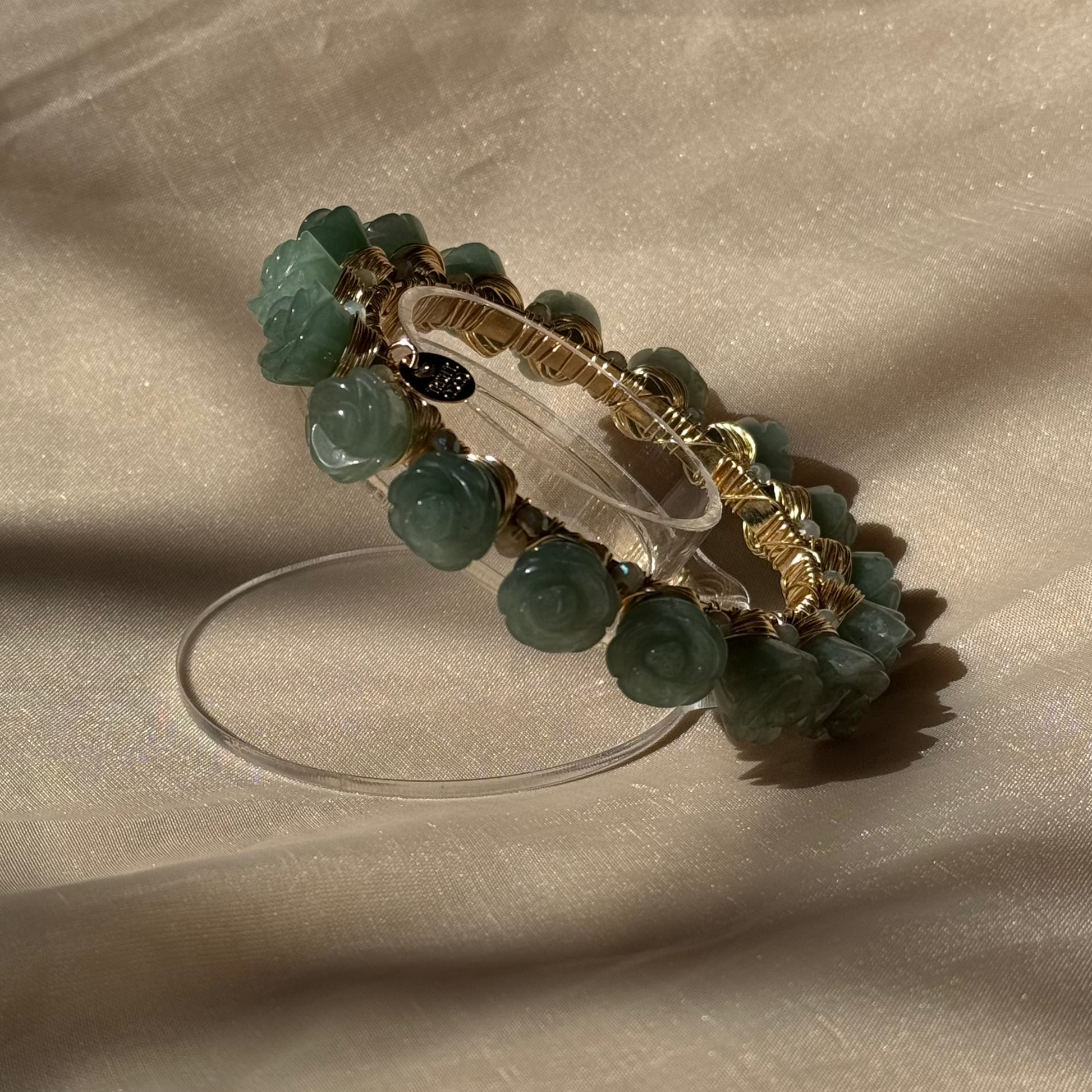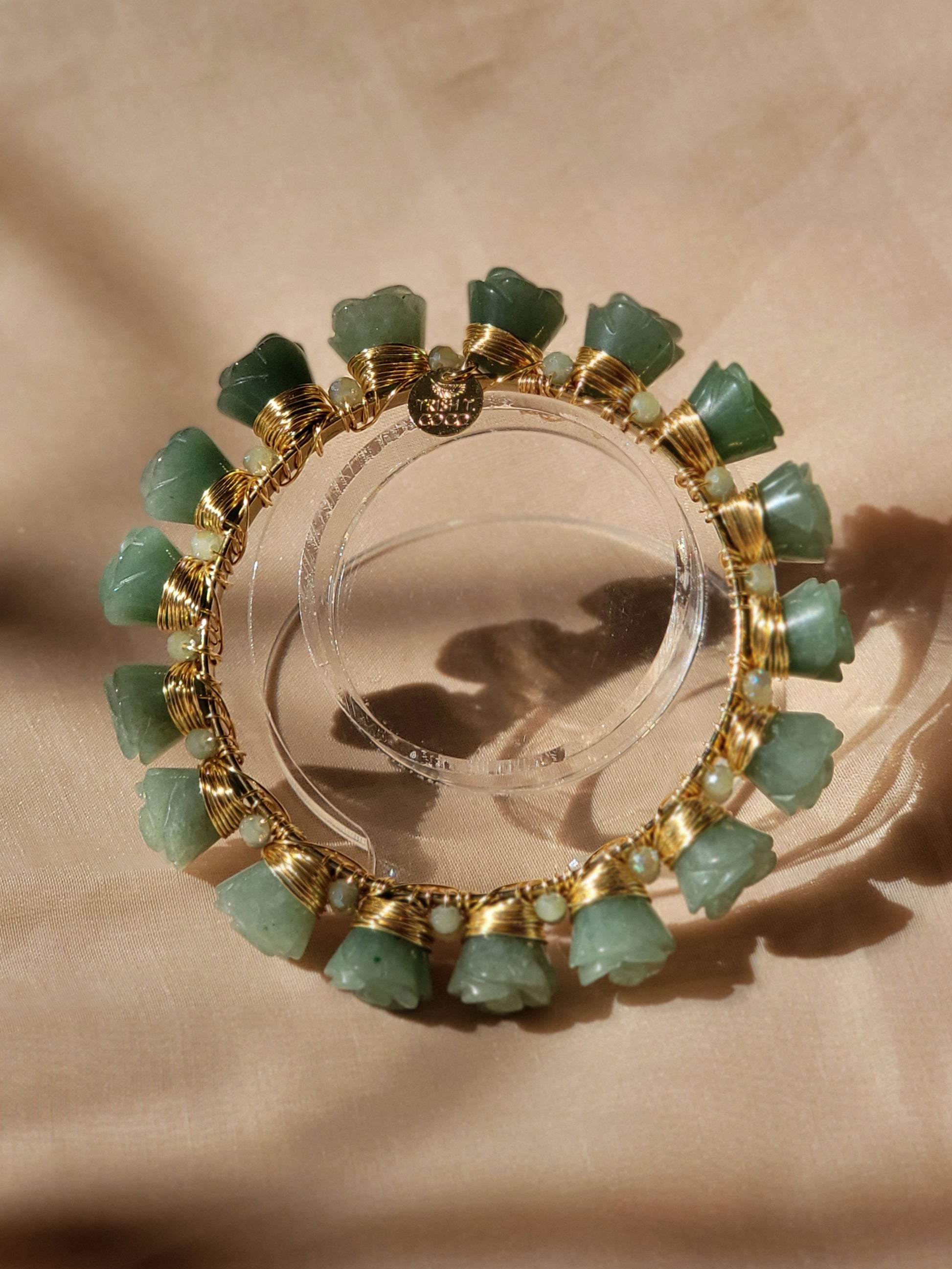 - Detalles: Piedras de jade verde talladas en delicadas formas de rosas, acompañadas de cristales austríacos entre cada piedra, que añaden un toque de brillo refinado.